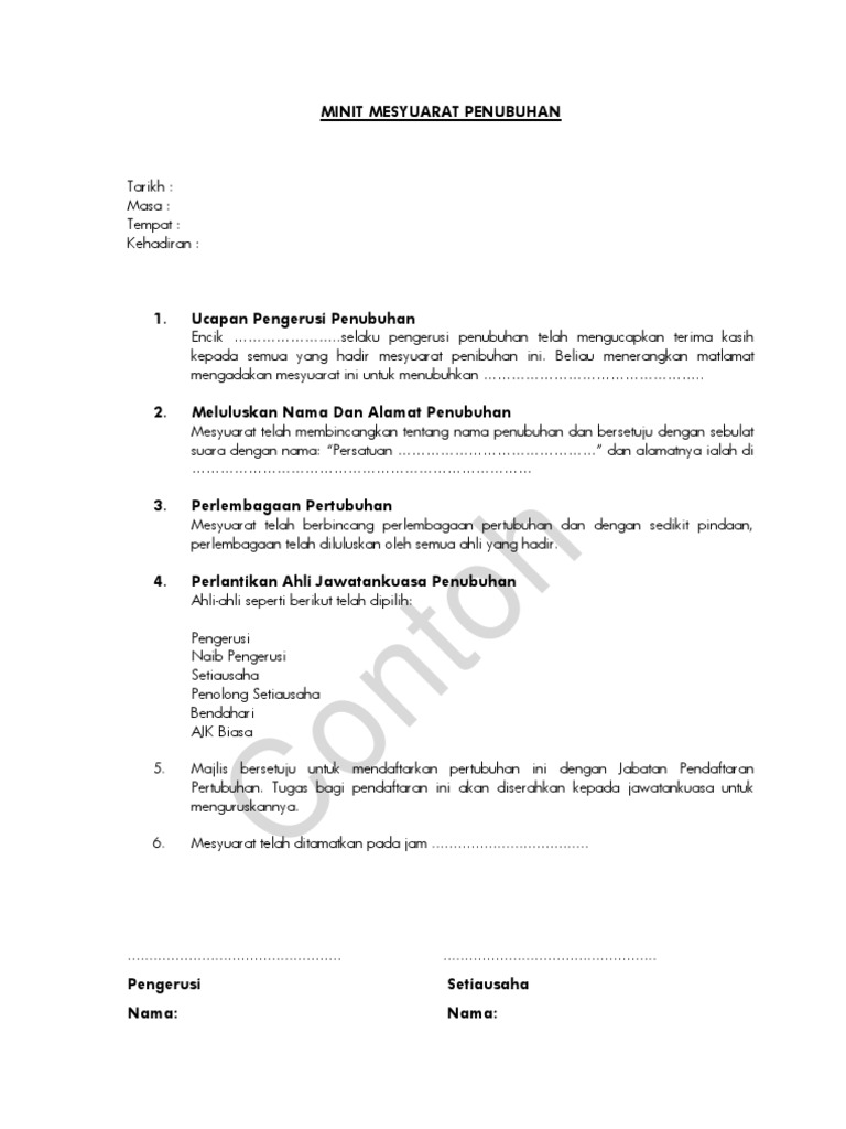 Related : Contoh Minit Mesyuarat Persatuan : Contoh minit mesyuarat yang nak dikongsikan ini adalah selaras dengan garis panduan kementerian pendidikan malaysia..