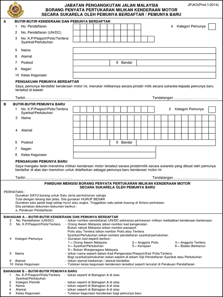 Kami tulis semula perkongsian berkenaan proses, prosedur dan cara tukar isi borang penyata pertukaran milikan kenderaan motor secara sukarela oleh pemunya berdaftar (jpj k3). Antaranya ialah penjualan aset hartanah, faraid, penceraian dan sebagainya. Beberapa hari yang lalu baru saja ngurus balik nama stnk motor tua. Silakan klik process tukar nama motor dekat jpj !!! tonton video saya terangkan langkah demi langkah proses tukar nama motor dan kereta . Tapi kalo nak wear nama motors, tak peril nak peg chee kat uspakom. Proses ini lebih mudah dan sesuai untuk pemilik baru dan pemilik asal semoga perkongsian mengenai cara tukar nama kenderaan di jpj dan juga proses thumbprint jpj tanpa pemilik baru atau lama ini bermanfaat. Untuk melakukan balik nama anda diperlukan membawa motor tersebut beserta beberapa dokumen yang diperlukan ke samsat daerah anda. Tapi saya tak nak sentimental bab bab motorsikal ni sebab ianya cuma kenderaan yang membawa kita dari point a ke. D text, bab proses pertukaran nama. Bagaimana apakah anda sudah siap melakukan. Terdapat pelbagai sebab seseorang individu ingin menukar nama pada geran rumah. Cara tukar nama geran kereta motosikal pemilik meninggal dunia.