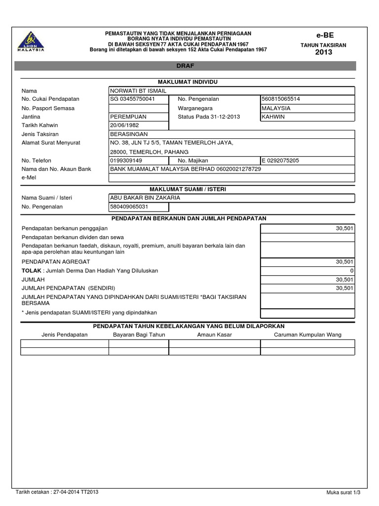 Baca perkongsian daripada maryam aziz, salah seorang lembaga pengarah produk mary jardin yang semakin menempah nama di malaysia. Peralatan sokongan asas (untuk individu kurang upaya, suami/isteri, anak atau ibubapa yang kurang upaya). Isi maklumat akaun bank jika anda mahu lebihan bayaran cukai dimasukkan ke dalam akaun bank. Jika isteri tidak bekerja atau mempunyai jumlah pendapatan yang tidak mencapai minimum dikenakan cukai, maka suami boleh menuntut pelepasan ke atas isteri sebanyak rm 4,000. Aku memberi nasehat kepada seorang pria yang hendak menikahi pemudi yang masih gadis, karena ia takut isterinya akan.