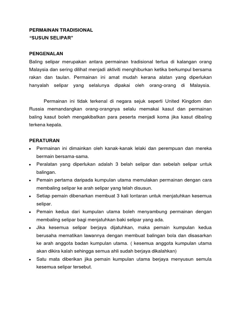 Permainan Tuju Kasut from imgv2-1-f.scribdassets.com Permainan baling selipar merupakan salah satu permainan tradisional rakyat yang terkenal sejak zaman dulu lagi. Jom, kita tengok kisah ini! 3 selipar disusun dengan cantik. Permainan baling selipar permainan galah panjang. Baling selipar / susun selipar. Ia sama seperti permainan baling tin cuma ditukar kepada selipar. 3 selipar diperlukan untuk permainan ini selipar disusun menegak dan dibaling untuk menjatuhkan. Permainan tutup oren permainan batu seremban.